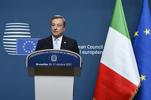 Mario Draghi, dans ses tout derniers jours en tant que premier ministre, tient une conférence de presse après une réunion au deuxième jour du sommet des dirigeants européens au bâtiment du Conseil européen à Bruxelles, le 21 octobre 2022.